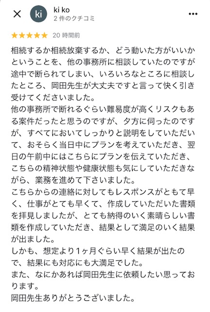 レビューには記載されておりませんが、ご相談時やお電話、ご納品時やご精算時にいただいたお声も掲載させていただきますので宜しければご参考にしてください。(どのお言葉も私にとってもいつも励みにさせていただいております。当事務所をご利用いただき誠にありがとうございました。)